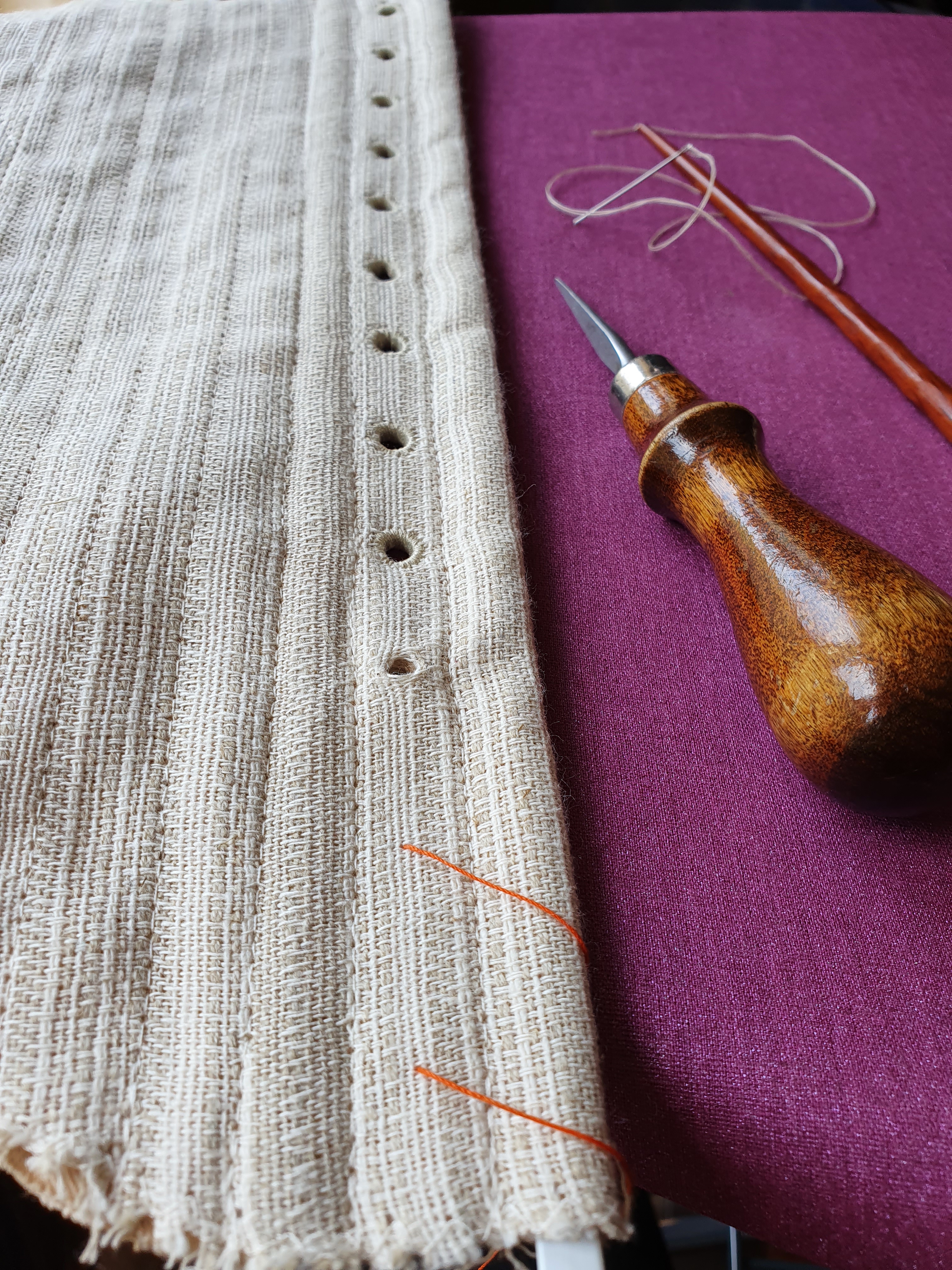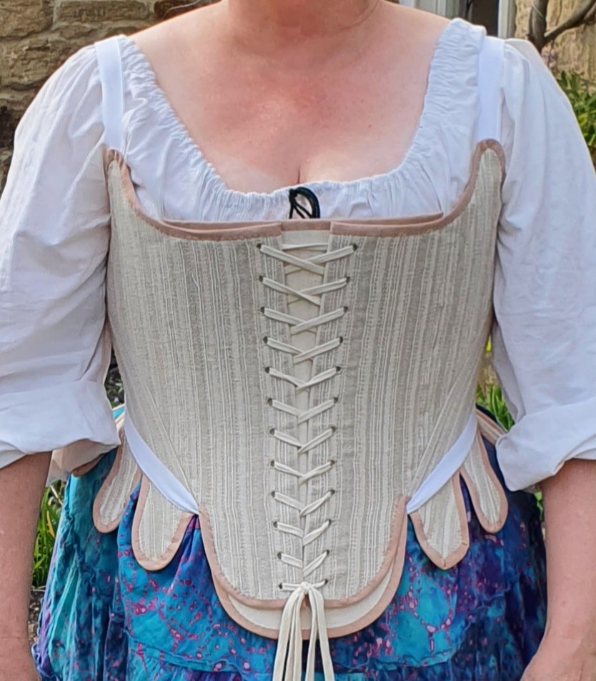 The priority this year was a set of stays and some pocket panniers to improve the silhouette of a roughly early to mid 18th century outfit I’d originally made using a set of Tudor stays as a base, lacking the time or budget to make new stays more appropriate to the period. The stays needed to be front and back lacing to allow individual dressing if no one was around to help, and I wanted them to be in a light coloured material. I used the American Duchess Simplicity 8579 pattern as a starting point, and added a stomacher to help stiffen the front. As both pieces were to be worn as underpinnings for my own use I chose to machine sew all boning channels for speed. Lacing holes and bindings were hand-finished.
