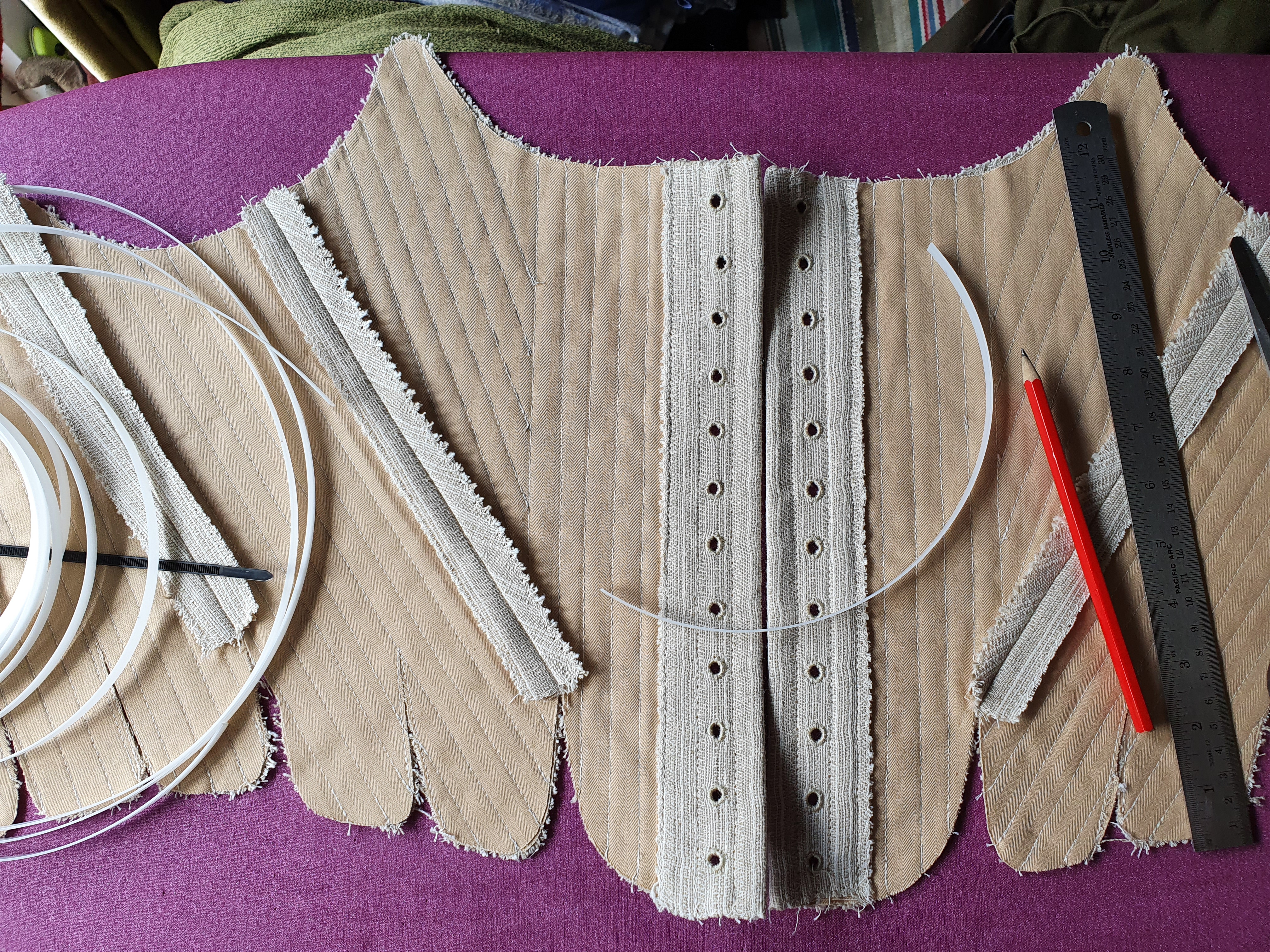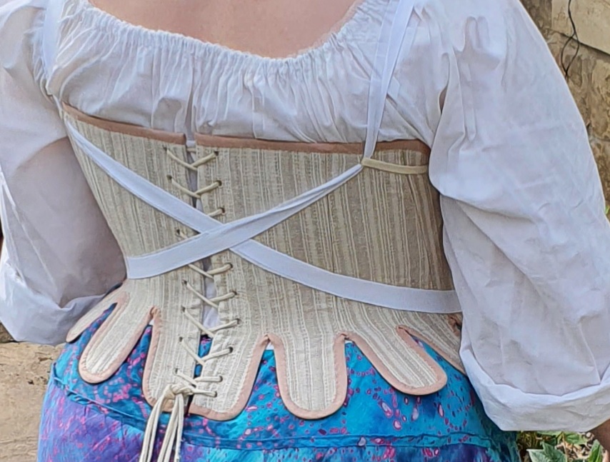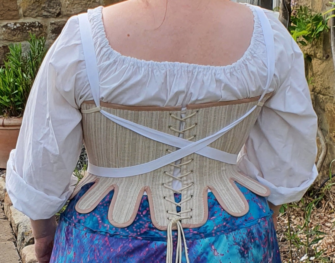 There were some issues with the fit post construction. I failed to allow for the ‘squish factor’ in my original measurements, meaning it fits perfectly and is very comfortable to wear, but my options for cinching it closer were limited. Overlapping the lacing holes at the back, then threading the lace through in a running stitch have since allowed it to be taken in a small amount, and stuffing a small padded roll down the front of the stays works well in giving extra support to the bust and to boost the cleavage.