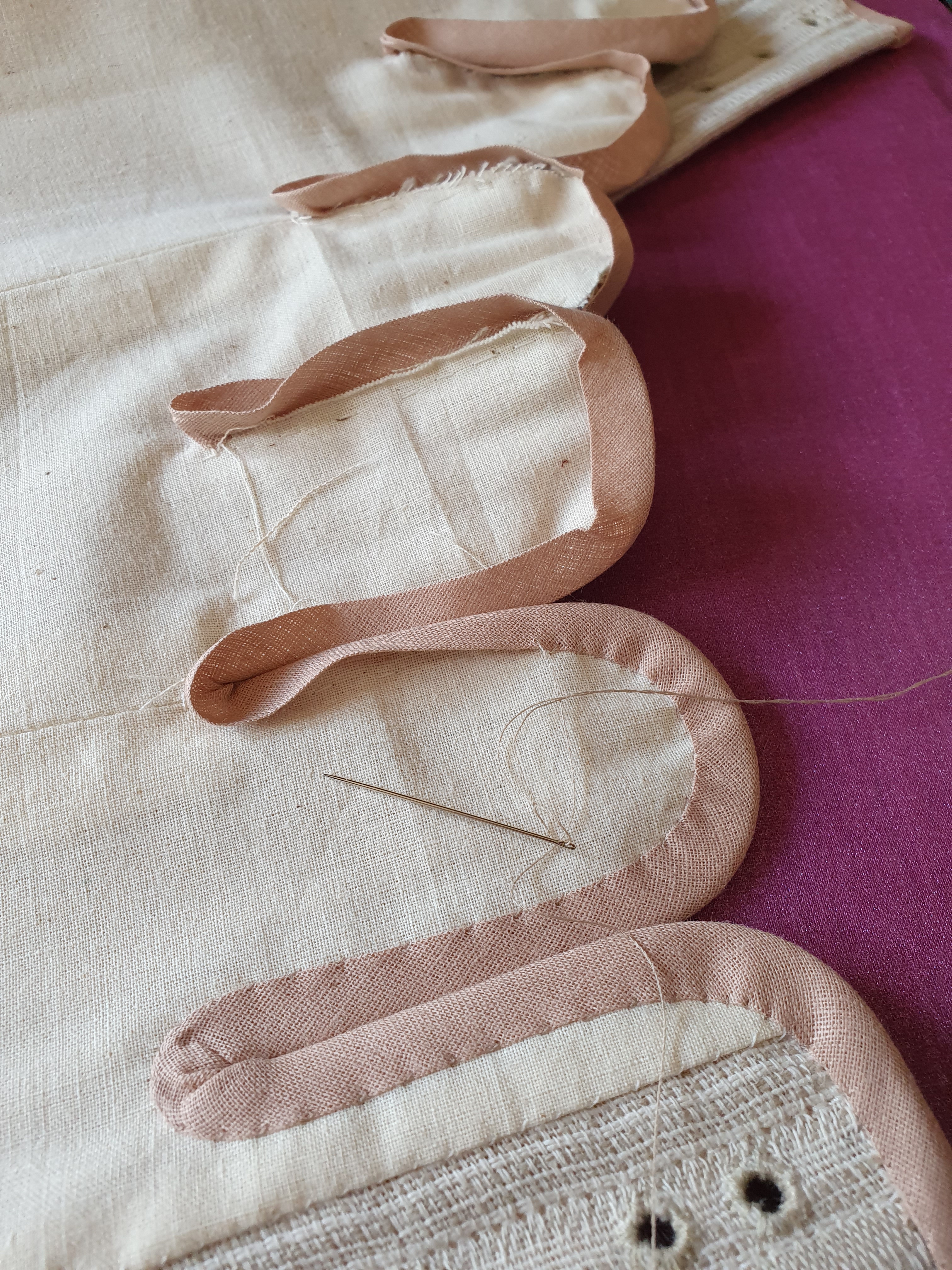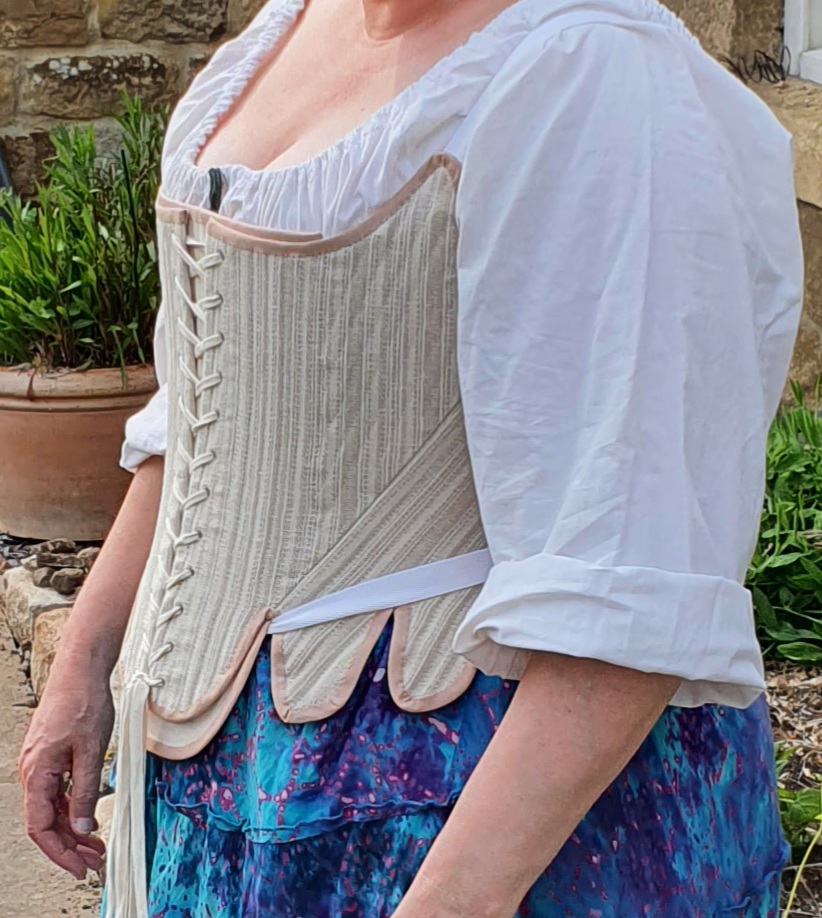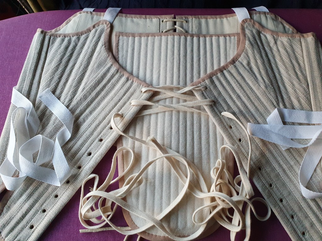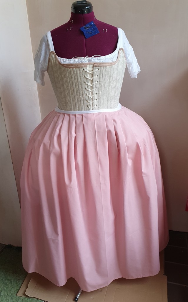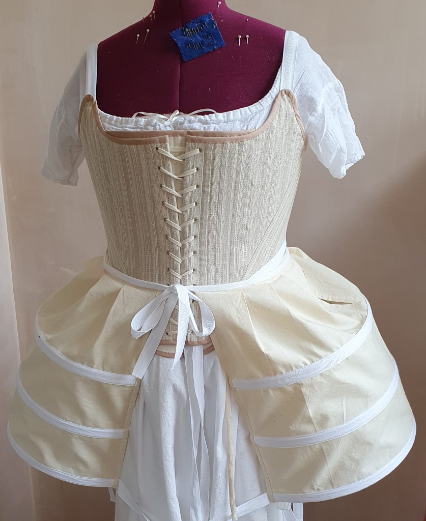 Fabric choices were based on what was already in storage, so the panniers were cut from a sturdy cotton drop cloth, and the stays had a double inner layer of coutil, with the outer layer a cotton/linen fabric and cream cotton for the lining. The stomacher was a double layer of cotton canvas, all bound in cotton bias binding.